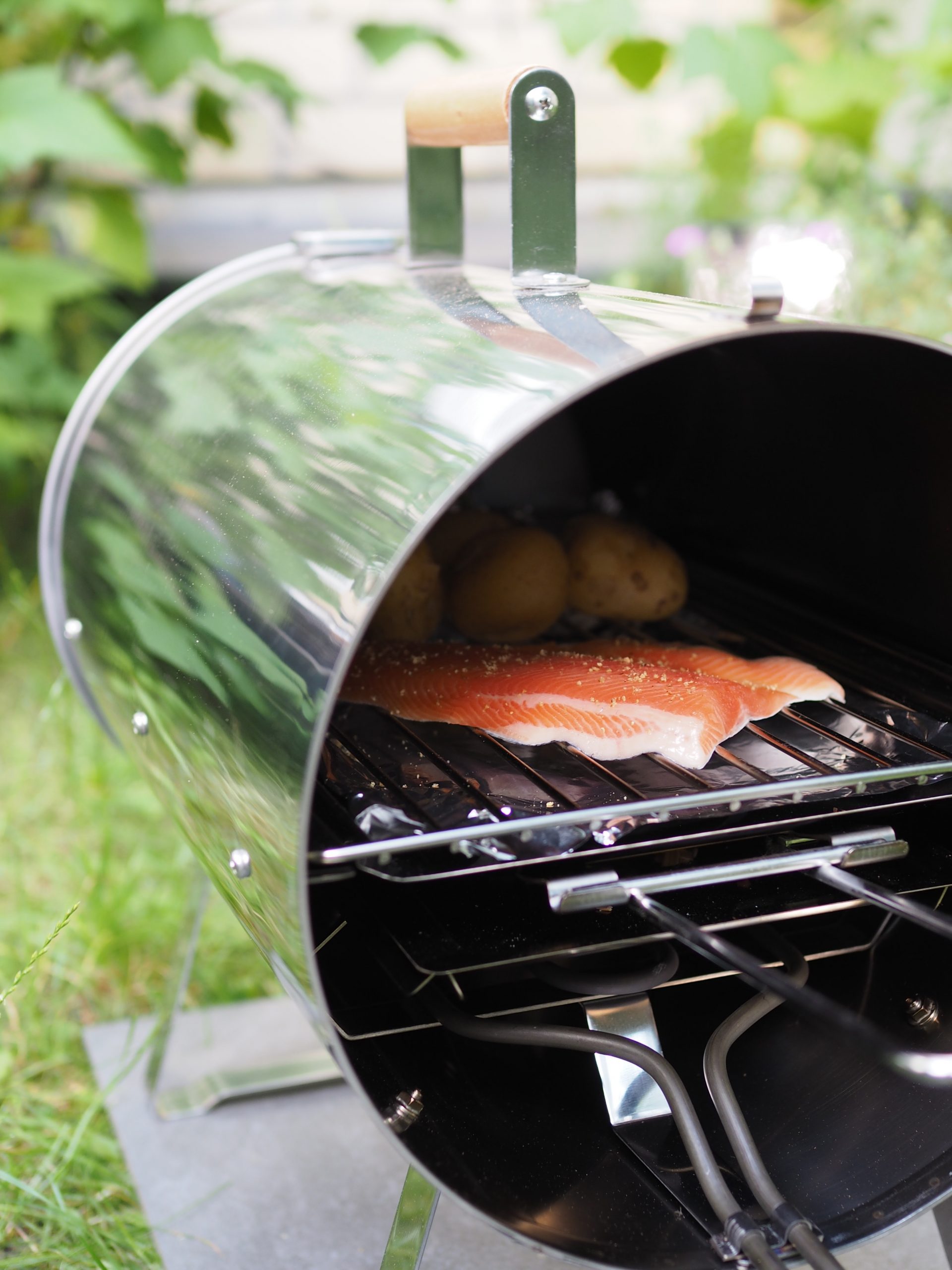 Seuraavaksi ajattelin savustaa muikkuja ja leipäjuustoa. Savustimella saa ruokiin ihanan, aromaattisen ja hienostuneen savun maun, jota ei uunissa paistamalla saa. Tavallisen uunin käyttö onkin jäänyt tänä kesänä olemattomaksi, kun on ollut niin turkasen kuuma keli. Lisäksi olemme viettäneet paljon aikaa mökillä, jossa ei ole uunia laisinkaan. Mutta savustin kulkisi sinnekin kevyesti mukana – jos vain vanhalla mummonmökillämme olisi sähköt.