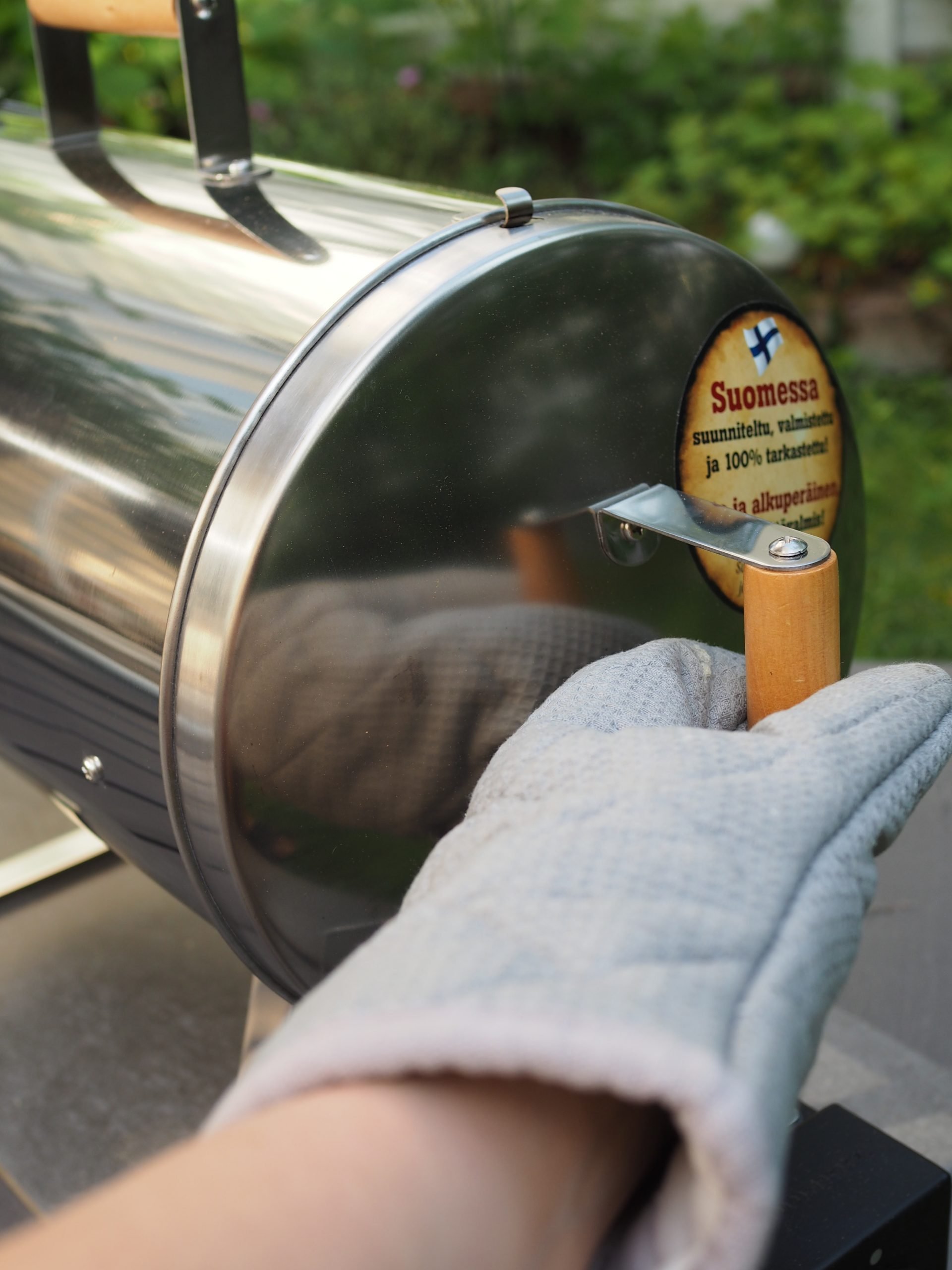Savustimen ulkopinta kuumenee savustuksen aikana polttavan kuumaksi, joten pönttöä ei pidä mennä koskettelemaan mistään muusta kohdasta kuin puisesta nostokahvasta tai kannen kahvasta. Viimeksi, kun savustelin, meidän utelias koiruli pörräsi vesi kielellä ympärillä. Mies sai vahtia silmä kovana, ettei koira polta itseään. Lapsemme ovat jo sen verran isoja, että heille riittää, kun sanoo asiasta.