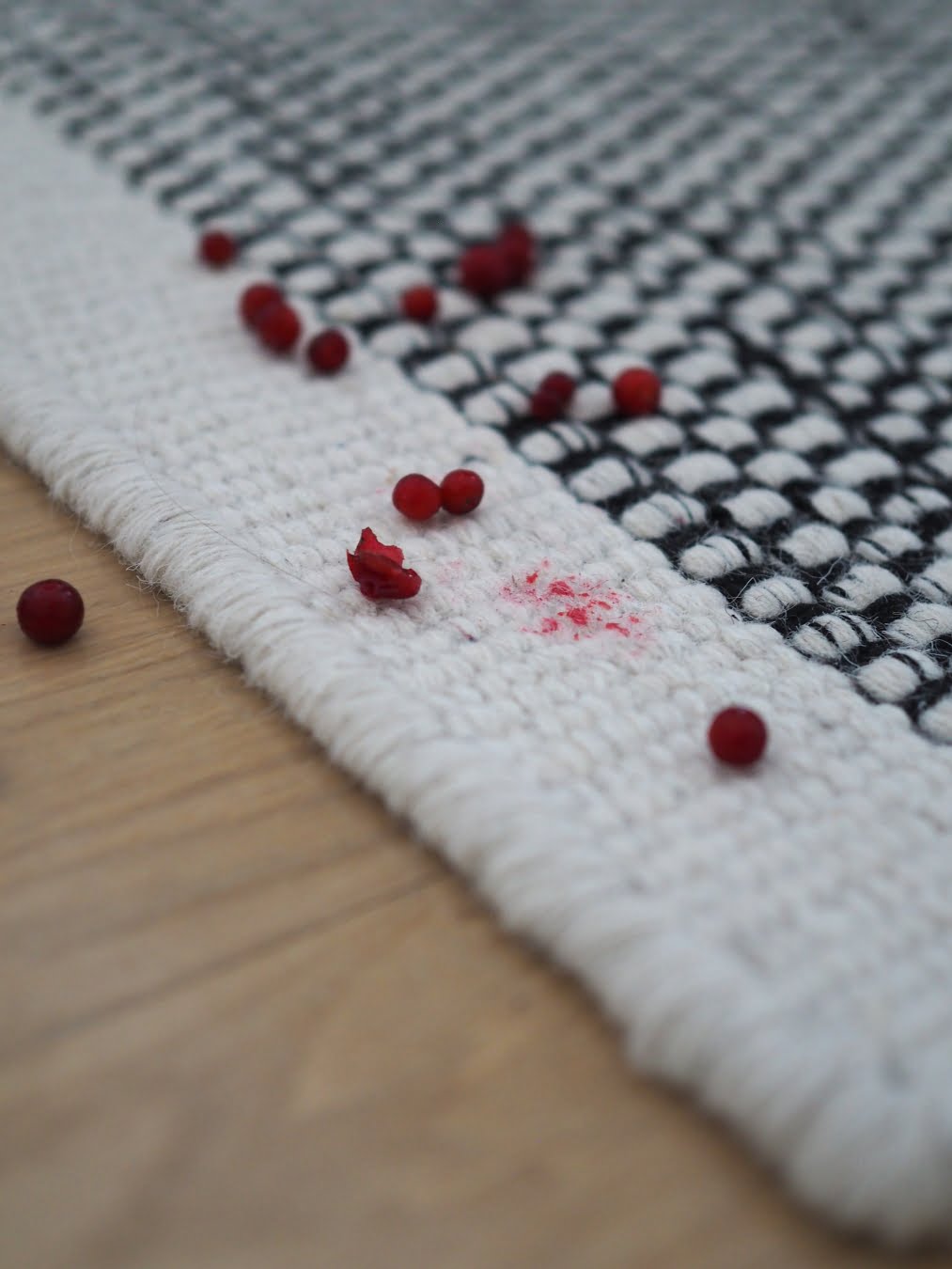 Hupsista heijaa, tuli sitten punainen puolukkatahra villamattoon ja tietysti juuri vaalean raidan kohdalle. Hetken ehdin miettiä epätoivoisena, onkohan matto pilalla kirkuvan huutomerkin takia.