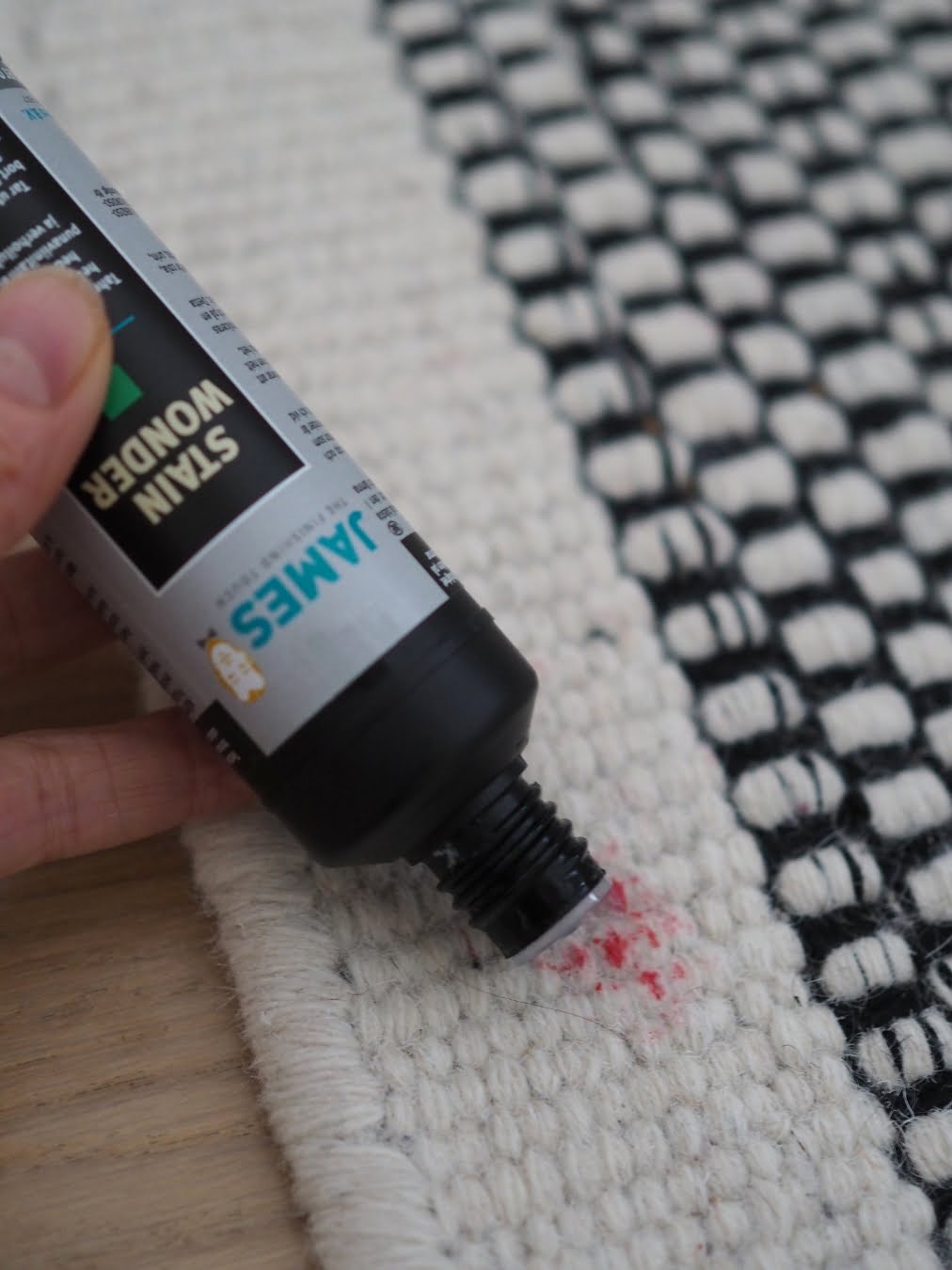 Jos mattoon tulee oikein itsepintainen ja tiukka tahra, turvaudun James-tahranpoistoaineeseen. Tahraihme poistaa matosta kahvi-, tee-, veri- ja punaviinitahrat. Sillä lähtevät hillo-, limonadi-, hedelmämehu-, maito-, ketsuppi-, kaakao- ja kastiketahrat, mitä nyt ikinä matolle saattaa mennäkään.