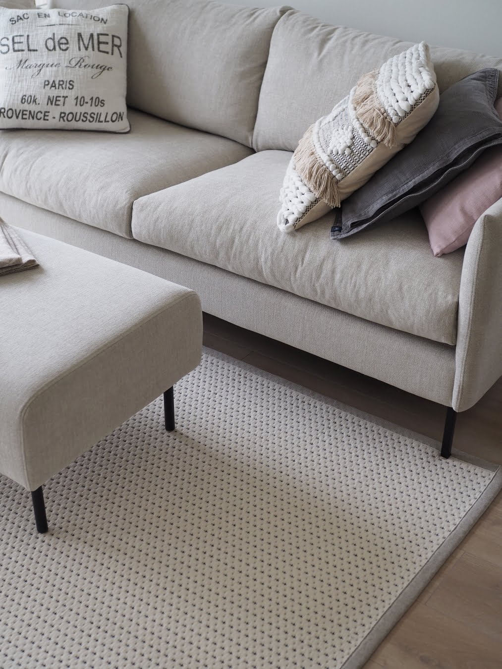Hauska sattuma on se, että maton kanttauksen väri on hyvin lähellä sohvan väriä. Matto oli edellisessä kodissa työhuoneessani, mutta nyt kiikutin sen olohuoneeseen – silläkin uhalla, että se on hieman liian pieni olkkariin.