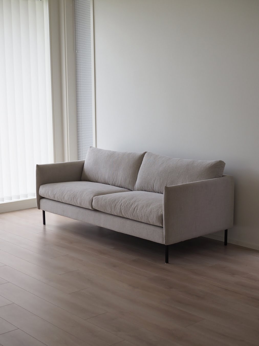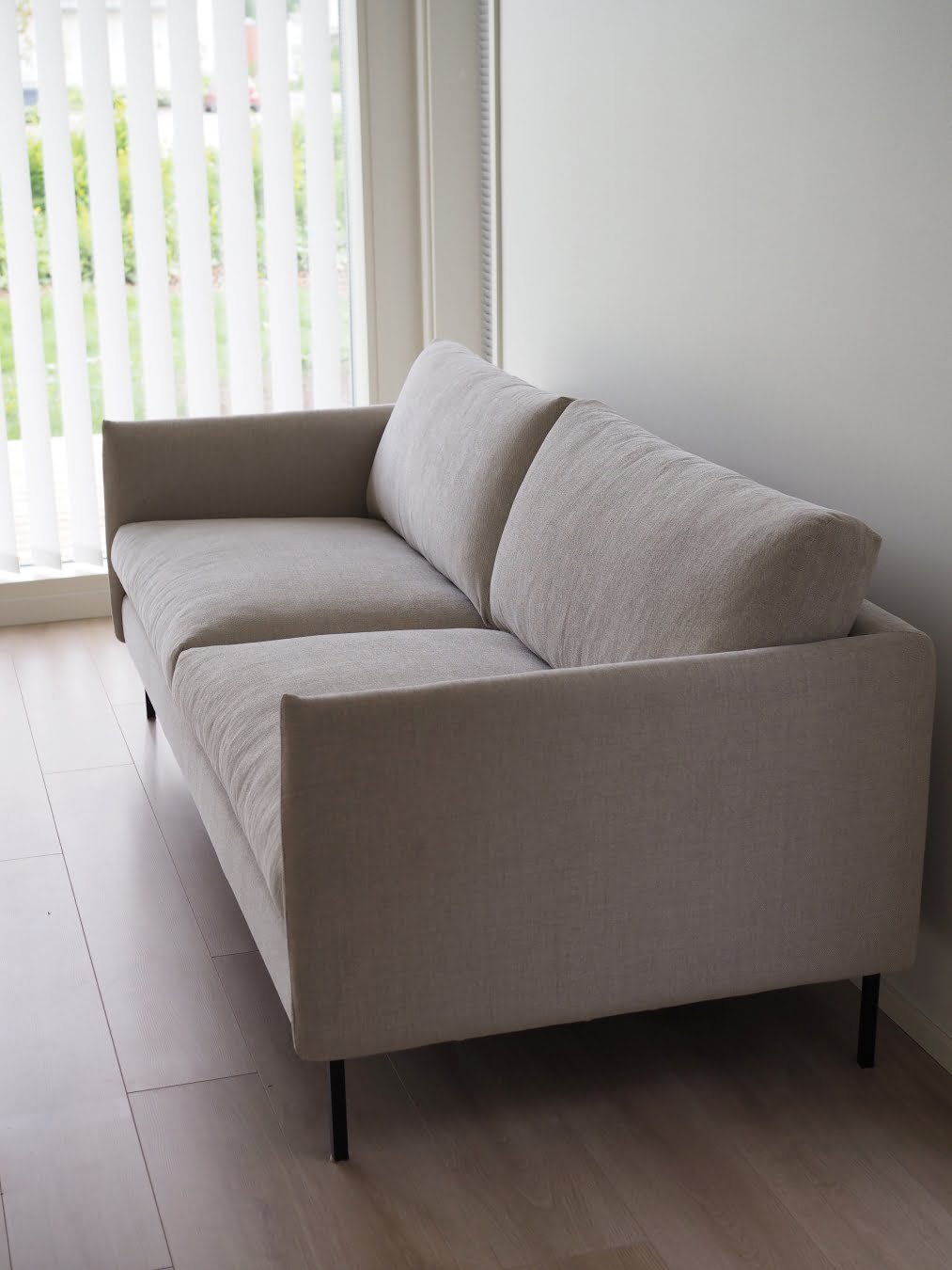 Sohvakankaan sävyn valinta sen sijaan oli tajuttoman vaikeaa. Päädyin lopulta Yedin vaaleaan beigen sävyyn 784. Se vaikutti sopivimmalta, mutta en ollut täysin varma valinnastani senkään jälkeen, kun uusi sohva oli tullut. Olin ruuvannut jalat kiinni ja sohva nökötti yksinään tyhjässä olohuoneessa. Osuiko sävy oikeaan vai menikö metsään?