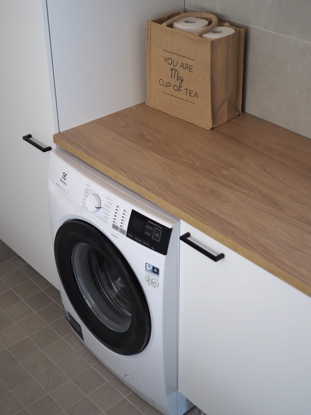 Pöytätilaa tarvitaan kylppärissä muuhunkin, esimerkiksi vaatehuoltoon. Mitä enemmän laskutilaa, sen parempi. Jos pöytätilaa on tarpeeksi, sitä voi käyttää myös tavaroiden säilyttämiseen ja esimerkiksi silittämiseen. Ostin meille pöytäsilityslaudan, joka vie vähemmän tilaa kaapissa kuin täysikokoinen silityslauta.