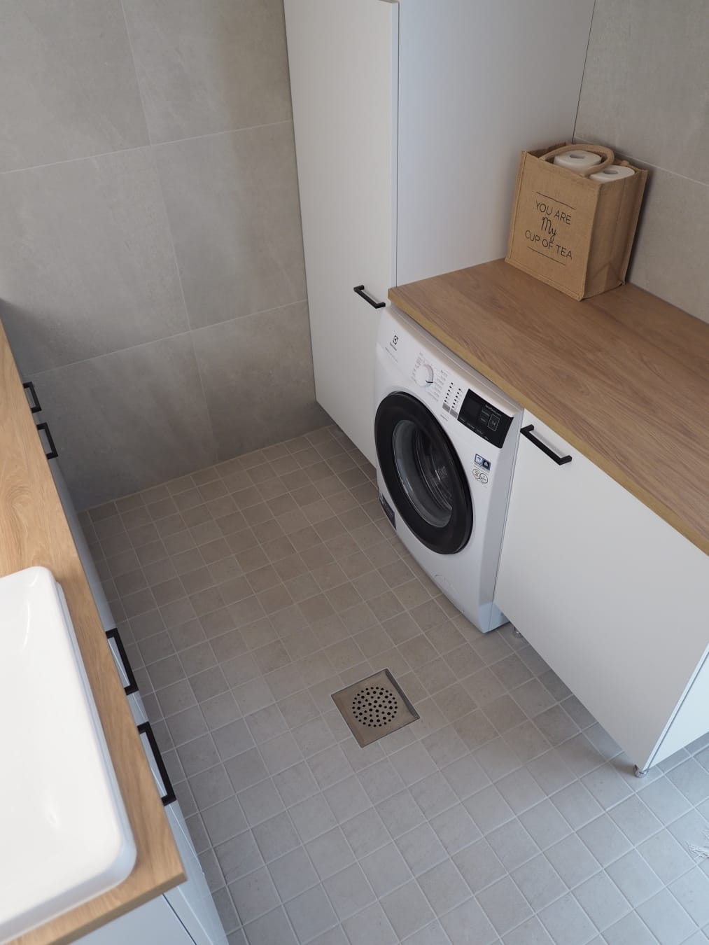 Kylpyhuone on sellainen, jollaisen olisin voinut itsekin suunnitella eli mieluinen. Ihastuin siihen heti, kun näin sen ensimmäisen kerran asuntonäytöllä. Eipähän tarvinnut alkaa repiä ja vaihtaa laattoja tai mitään muutakaan. Laattojen vaihto tai muu iso purkuhomma tuskin olisi onnistunutkaan mutta yhden pienen muutoksen teetätin.