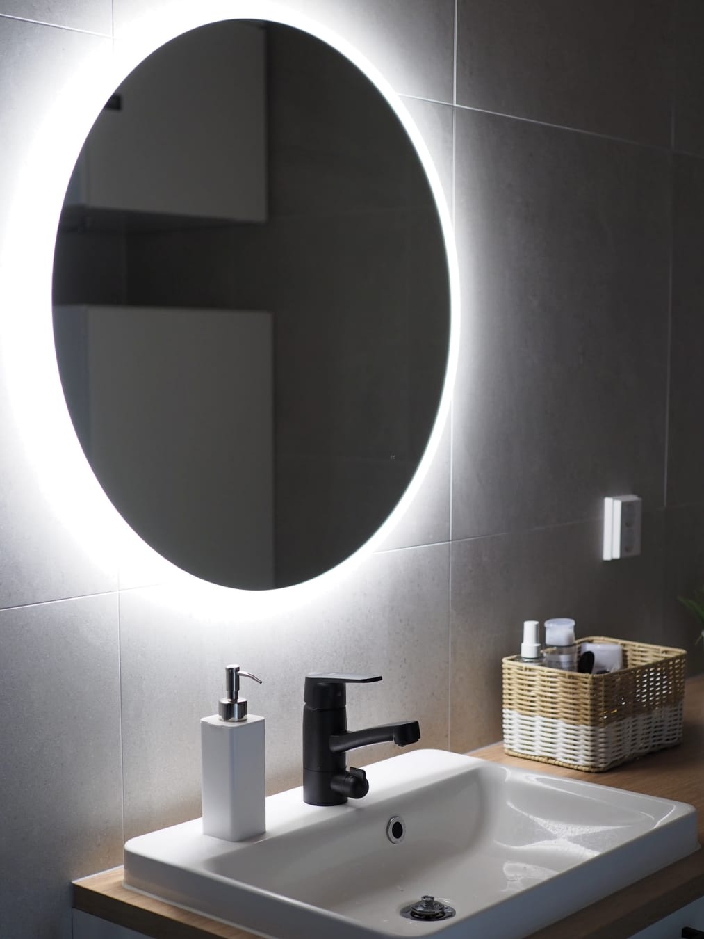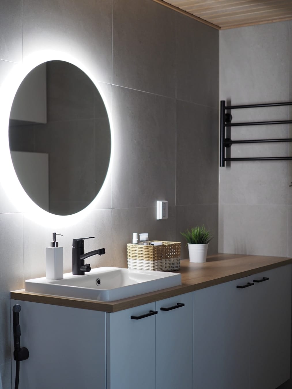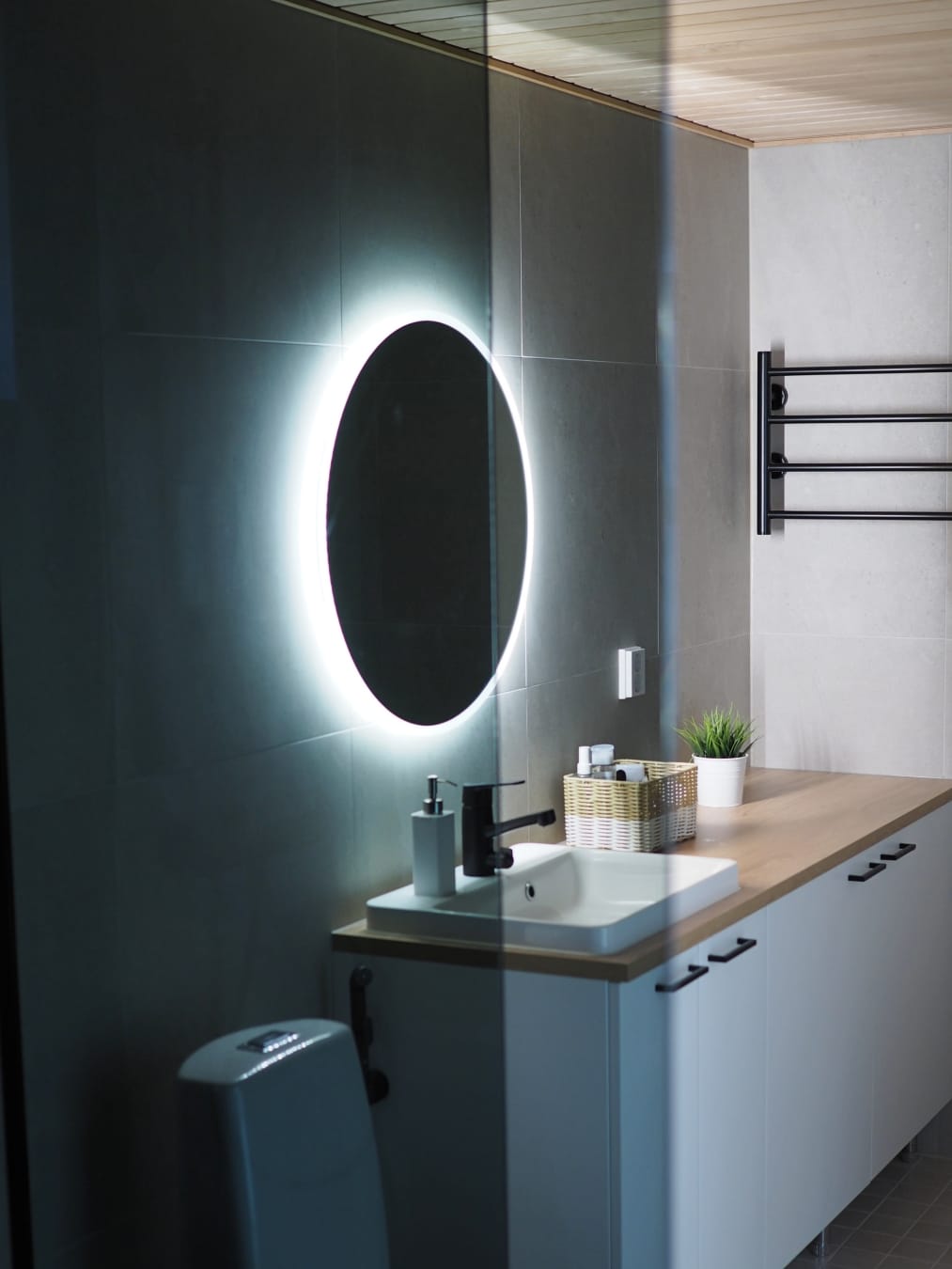 Led-valolla varustettu kylpyhuoneen kaappi on toki toinen vaihtoehto. Siellä säilyvät purkit ja purnukat näppärästi käden ulottuvilla. Meillä oli aiemmin peilikaappi mutta itse tykkään peilistä enemmän. Se vie vähemmän tilaa syvyyssuunnassa ja on sirompi.