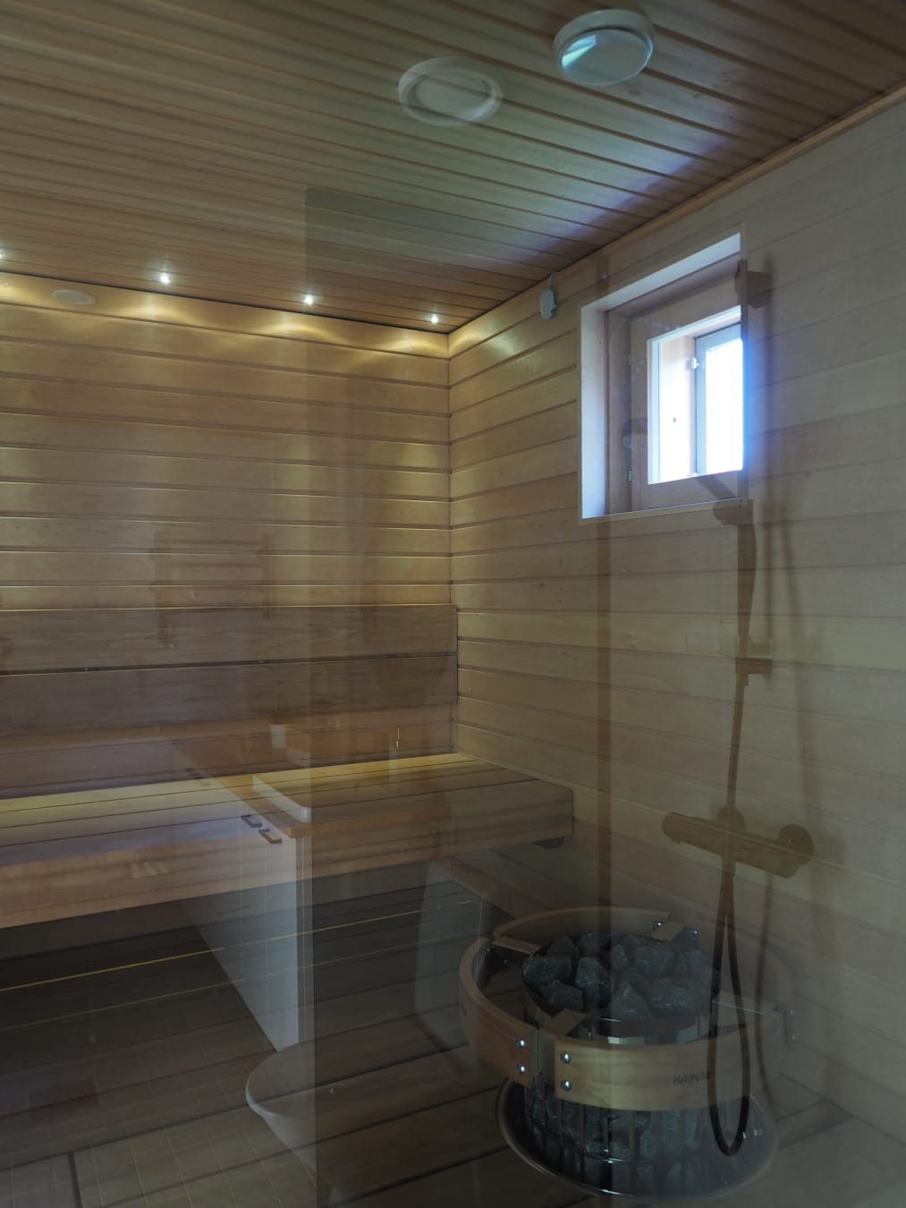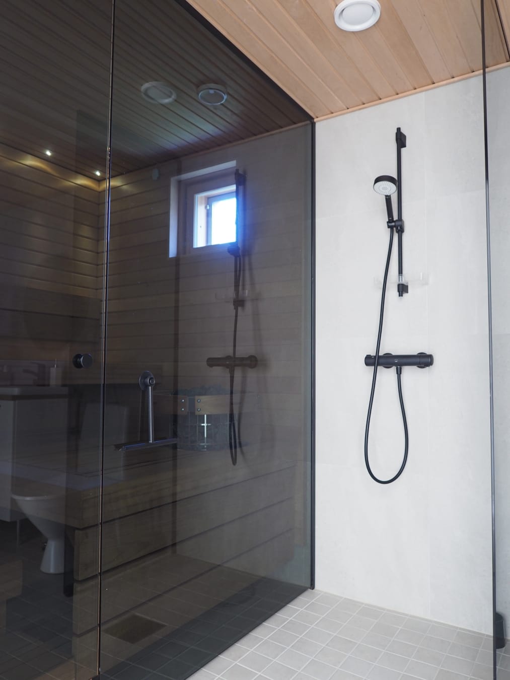 Tumma lasiseinä suihkun ja saunan välissä aiheutti minussa ensin vähän kahtalaisia ajatuksia, kun en ollut sellaiseen tottunut. Toisaalta tykkäsin, toisaalta en. Onko kivaa, kun saunasta näkee kylpyhuoneeseen ja päinvastoin?