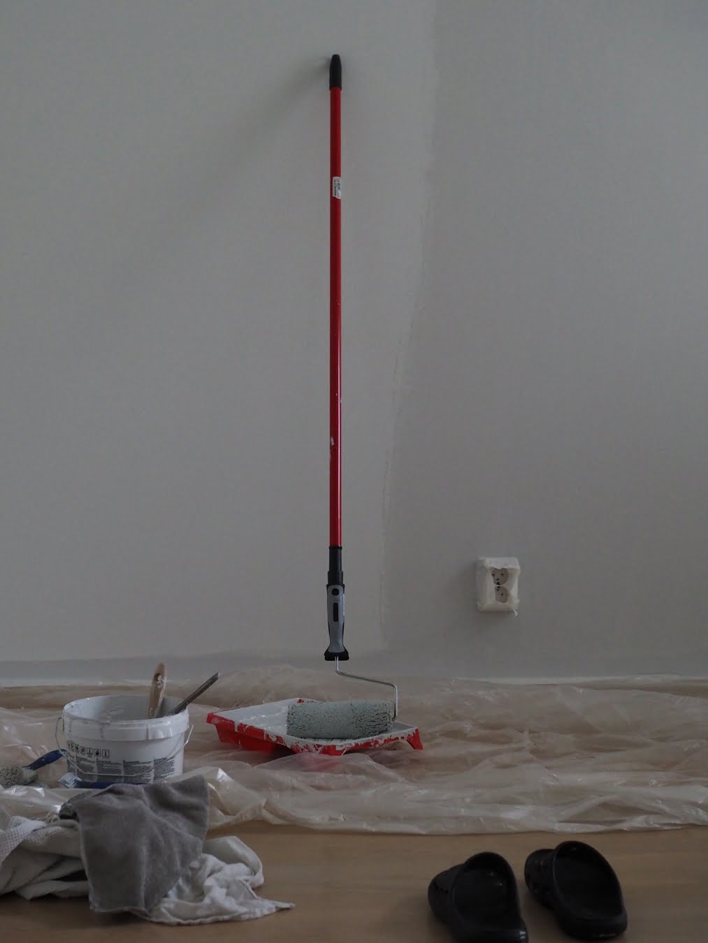 En olisi jaksanut enkä ehtinyt raivata ja maalata koko huonetta – varsinkaan, kun inspiraatio iski kesken työpäivän. Yhden seinän maalaaminen oli helppoa ja nopeaa. Siirsin vain taulun seinältä ja muutaman tavaran tieltä pois, puhdistin maalattavan pinnan ja kiinnitin rajausteipit paikoilleen. Sitten laitoin telan heilumaan.