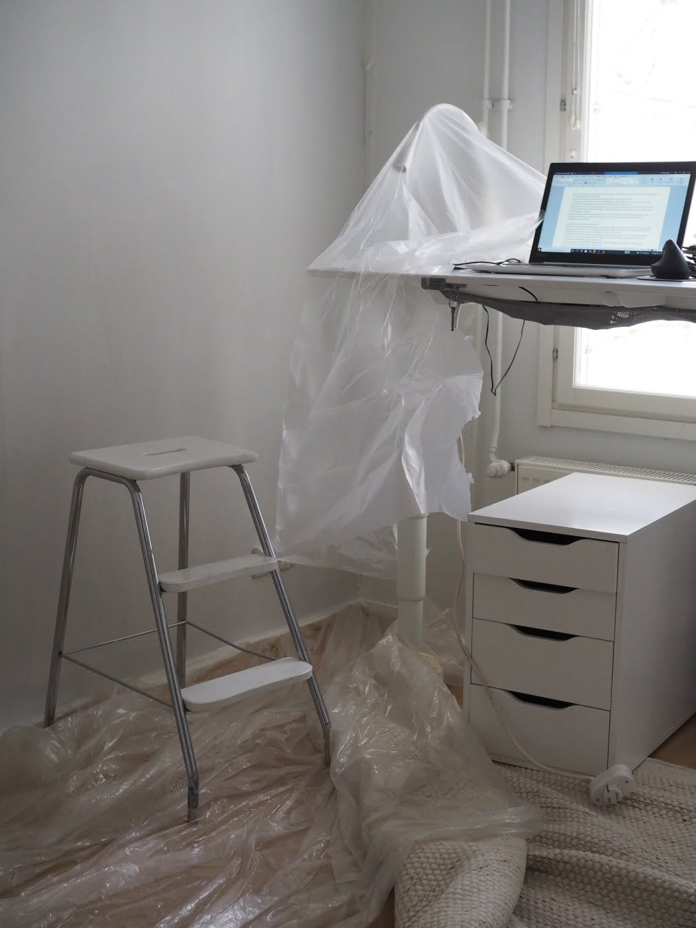 Vaikka sävy oli tuttu, testasin sitä ensin pienelle alueelle työhuoneen seinään. Valo vaihtelee Suomessa paljon ja sama sävy voi näyttää aivan erilaiselta luonnonvalossa, keinovalossa ja pimeällä. Työhuoneen seinän sävykin muuttuu hämmästyttävän paljon vuorokauden, vuodenajan, pilvisyyden ja aurinkoisuuden mukaan.