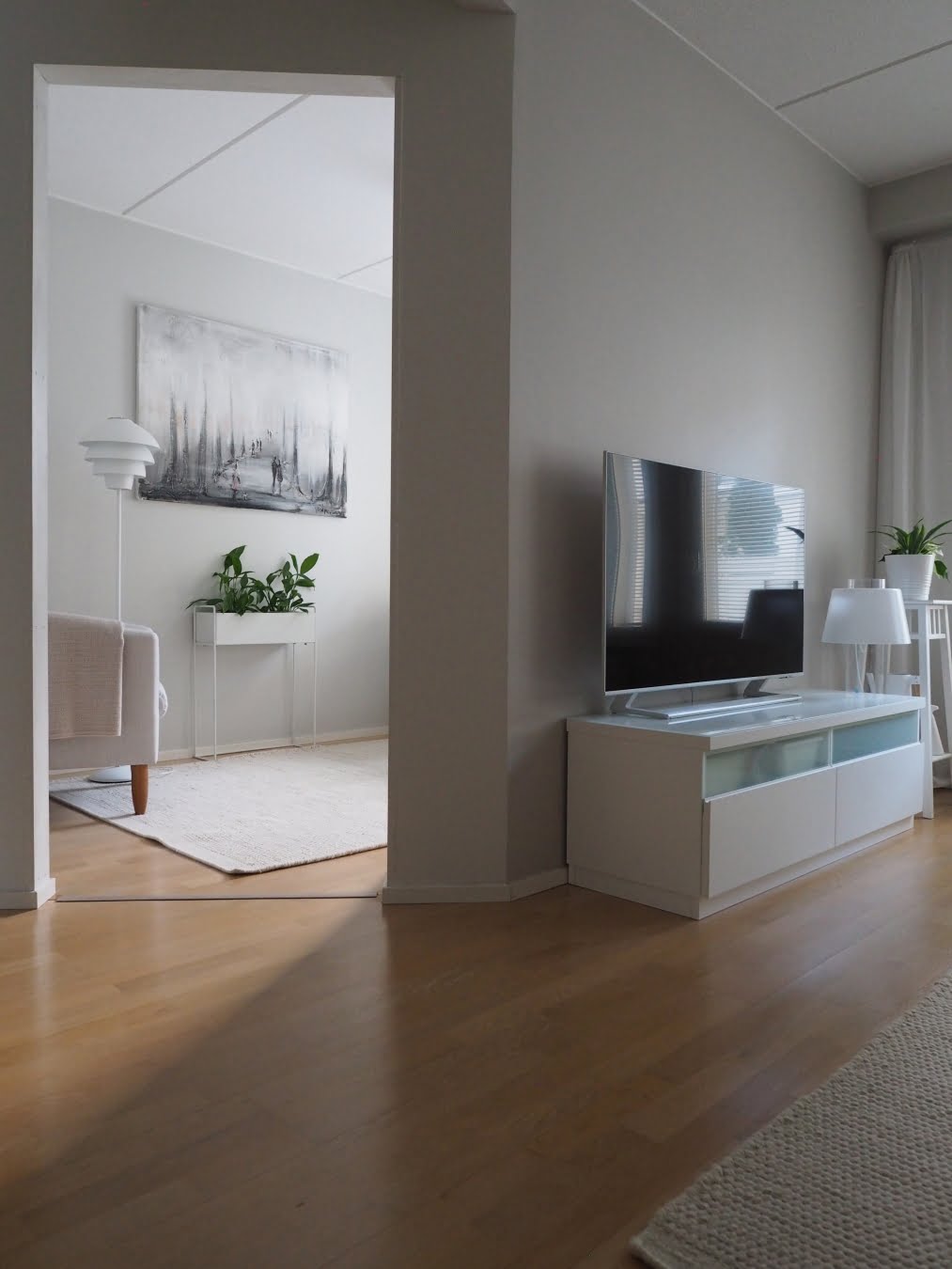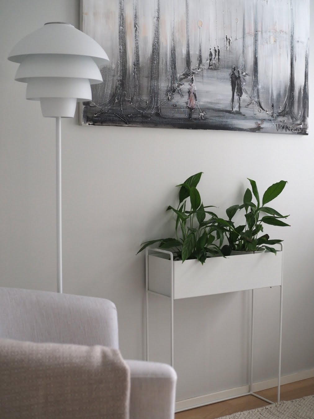 Mutta minulle riittää mainiosti tämä pieni huoneen ilmeen päivitys. Nyt huoneen suurin seinä ei ole enää niin kovan valkoinen, vaan pehmeämpi. Virpi Mäkisen taulu sulautuu harmahtavaan seinän sävyyn paremmin. Valkoinen lattiavalaisin puolestaan erottuu selvemmin ja pääsee paremmin oikeuksiinsa, kun tausta ei ole enää valaisimen kanssa samanvärinen.