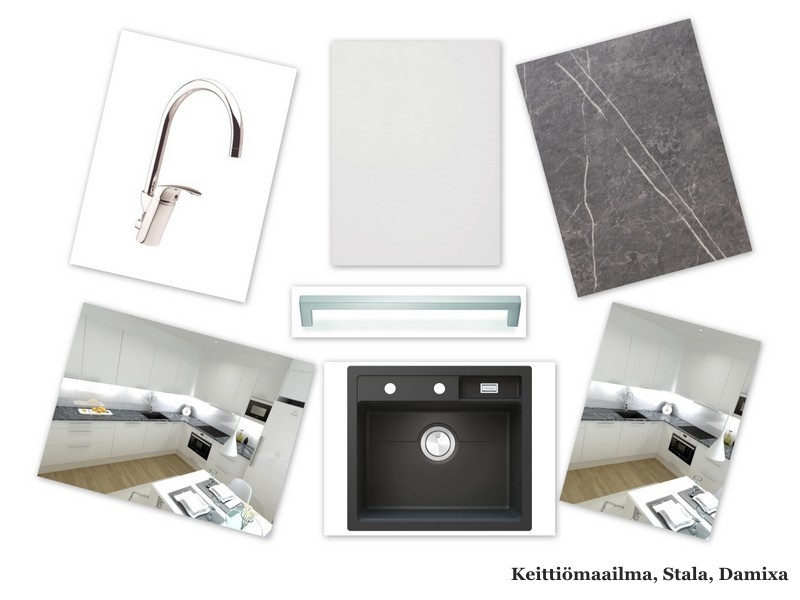 Valkoinen välitilalevy, harmaa laminaattitaso ja Stalan allas löytyvät meiltäkin. Pitkään suunniteltu keittiöremontti käynnistyi kun löysin Stalan altaasta kuvan ja ihastuin siihen; pois en antaisi.
