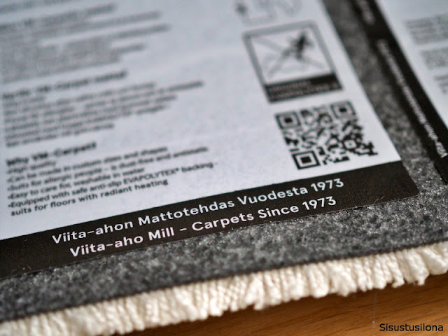 Jos ja kun koko matto pitää pestä, sille suositellaan kuivapesua vaahdolla tai hellävaraista ammattimaista tasovesipesua enintään 30-asteisella hienopesuaineliuoksella. Mutta palailen tähän matonpesuasiaan varmasti vielä myöhemmin, kunhan matto ehtii likaantua.