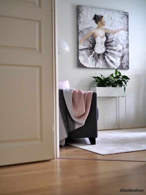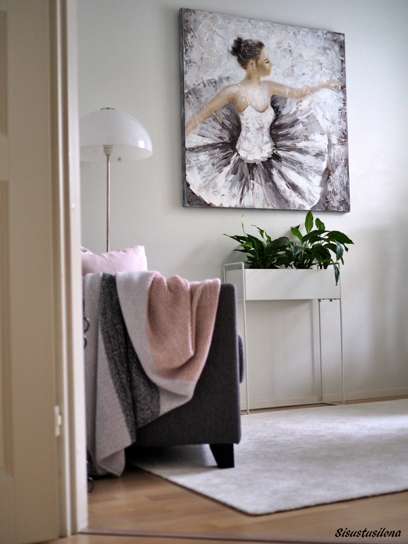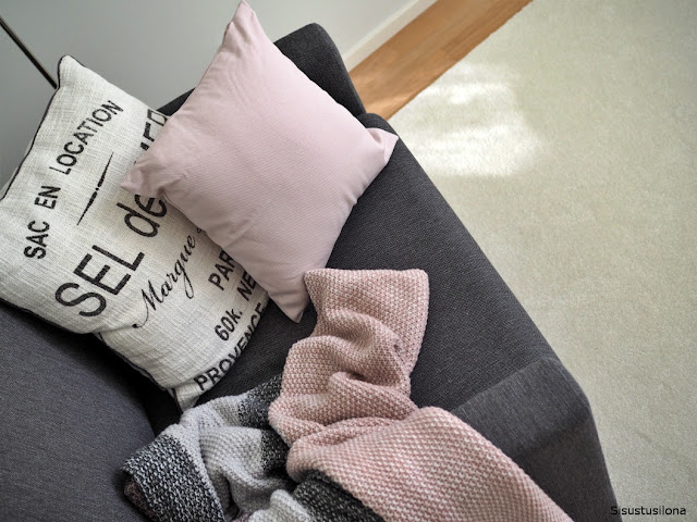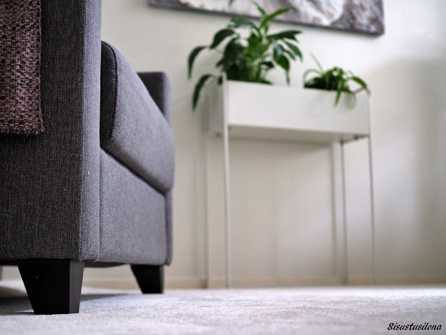 Tykkään valkoisen Hattara-maton yksinkertaisuudesta ja ajattomasta tyylistä. Mattoon on helppo yhdistellä monenvärisiä verhoja, tyynyjä ja huopia. Vielä en ole ryhtynyt tekstiilejä muuttelemaan, vaan entisillä mennään. Tunnen kuitenkin itseni ja tiedän, että jossain vaiheessa vaihtelunhalu taas iskee.