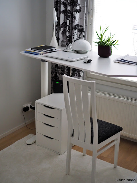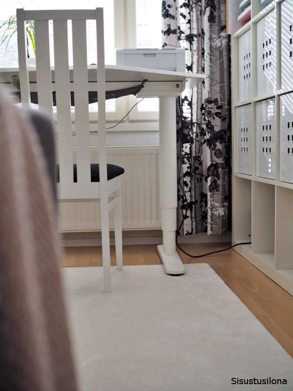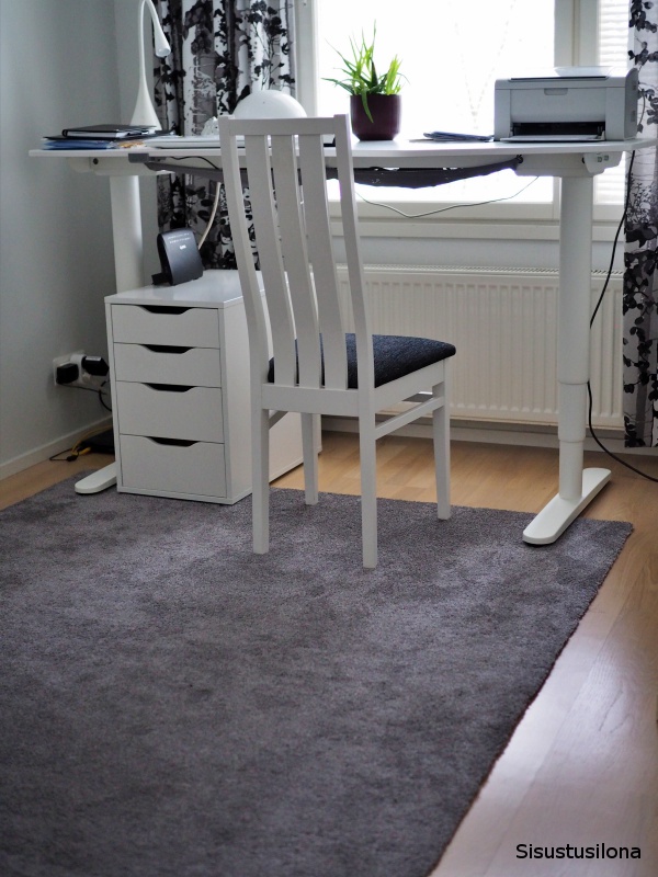 Sen lisäksi, että matalanukkainen Hattara-matto on kaunis, se tuntuu miellyttävän pehmeältä jalkojen alla. Tämä on tärkeä ominaisuus, sillä seison tuntikausia päivässä työpöydän ääressä. Tuolikin minulla on, mutta istun siinä hirveän harvoin. Sähköpöytä on lähes aina yläasennossa.