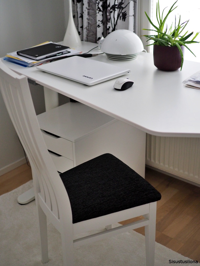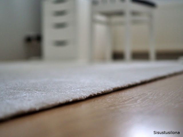Nyt olen iloinen ja tyytyväinen lopputulokseen. Työhuoneen ilme valaistui ja keveni vaalean maton myötä. Vaikka matto on valkoinen, se ei kuitenkaan ole mielestäni liian kylmä. Maton väri on vähän kermainen ja pehmeä. Eron huomaa hyvin, kun vertaa sitä huoneen vitivalkoisiin kalusteisiin. Tähän huoneeseen sopii hyvin 160 x 230 -senttinen normikoko mutta mattoja voi tilata VM Carpetilta myös omien mittojen mukaan.