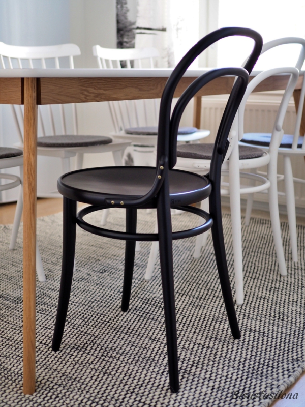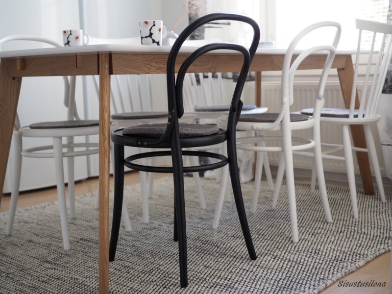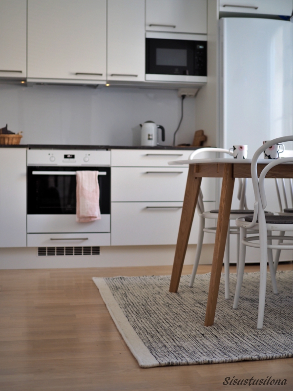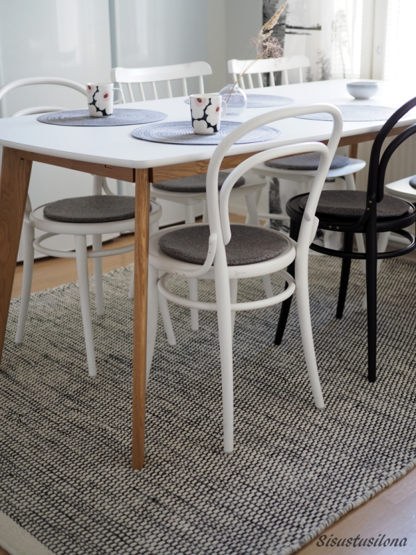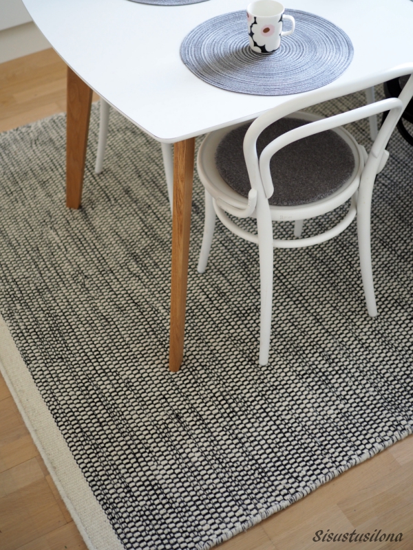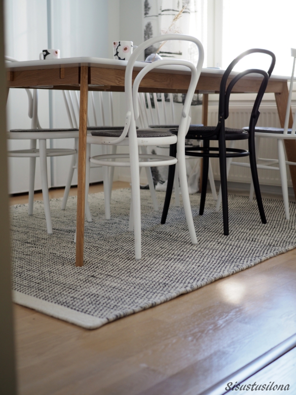 Aiempi keittiönmattomme oli harmaa, ja ajattelin aluksi, että myös uusi matto saisi olla harmaa. Mutta tämä mustavalkoinen näyttää kyllä tosi raikkaalta ja sopii ruokailuryhmän alle erityisen hyvin nyt, kun keittiössä on yksi musta Ton-tuoli valkoisten joukossa.