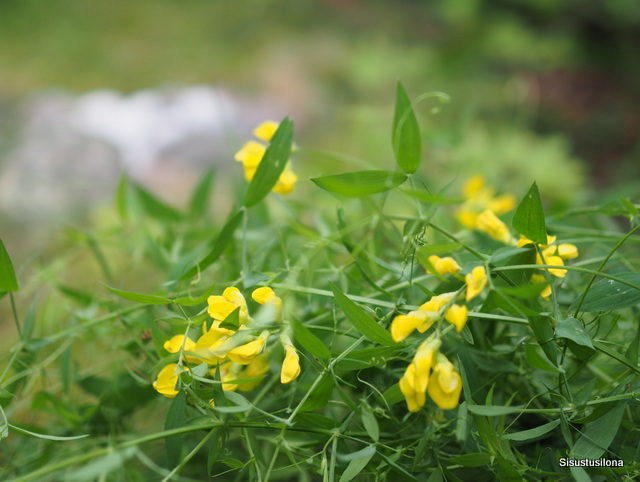 Ainoa keltainen kasvi, joka pihallamme nyt kukkii, on niittynätkelmä. Se on päätynyt meille läheiseltä niityltä. Niittynätkelmä koristaa pienenä ryppäänä nurmikkoa niin kivasti, etten raaski leikata sitä pois.