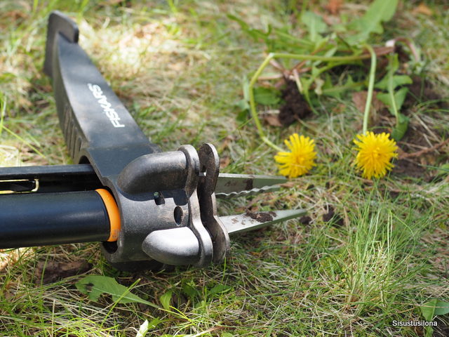Nips-naps vaan, rikkaruohonpoistaja osoittautui varsin käteväksi. Työkalun terät tarttuvat voikukan juureen joka puolelta ja rikkaruoho nousee juurineen vipuvoimalla helposti ylös maasta. Työkalun varsi on pitkä, joten ei tarvitse kumarrella tai kyykkiä.