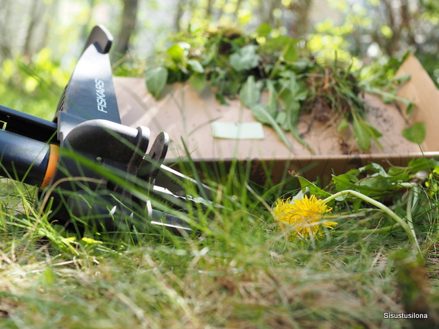 Ajattelin ensin, että voikukkia on pienellä pihallamme ehkä kymmenen ja niiden poistaminen käy joutuisasti. Homman edetessä silmä kuitenkin harjaantui ja voikukkia löytyi koko ajan lisää. Tuollakin on, ja tuolla, ja tuolla. Ne piiloutuvat hyvin nurmikon sekaan, kun ne eivät vielä kuki. Montakohan mahdoin poistaa? Ainakin 50.