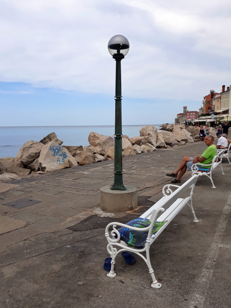 Kävimme uimassa monta kertaa päivässä, ja se oli meille ihan parasta lomaa Piranissa. Rantakadulle mahtuvat sulassa sovussa niin uimarit kuin auringonottajat, kävelijät ja ravintolatkin.