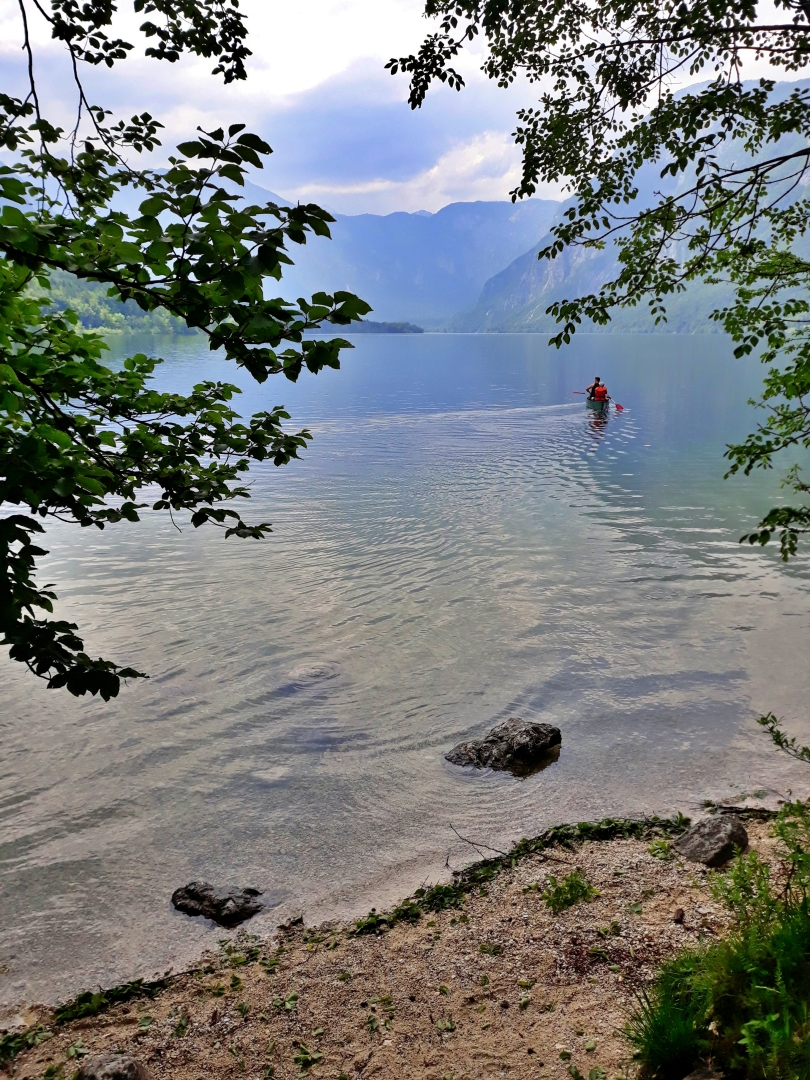 Rakastuin Bohinj-järveen ensisilmäyksellä, vaikka juuri sillä hetkellä pilvet roikkuivat järven ympärillä ja vettäkin tuli muutama pisara. Tuo olikin reissumme ainoa hetki, kun saimme pisaraakaan vettä niskaamme. Sää on Sloveniassa kesällä helteinen, mutta sade- ja ukkoskuurot voivat yllättää. Meidän kuuden päivän reissumme aikana kesäkuun alussa lämpötila pysytteli yli +28 asteessa ja kipusi toistuvasti yli +30 asteen.