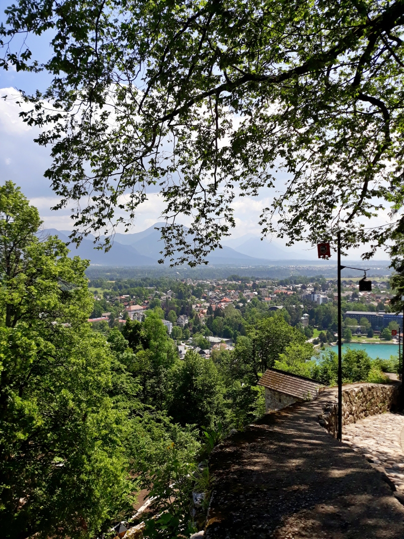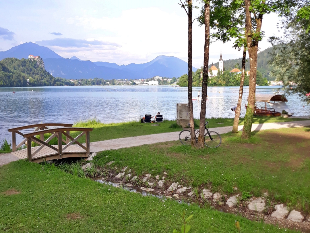Bled-järven ympäri kulkee noin kuuden kilometrin pituinen, hyväkuntoinen kävelytie, jonka varrelta on hyvät näkymät järvelle eri suunnista. Kävelimme järvenrantaa pitkin aamulla, kun sää ei vielä ollut tukahduttavan kuuma. Emme kuitenkaan kiertäneet koko järveä, sillä aamiainen kutsui.