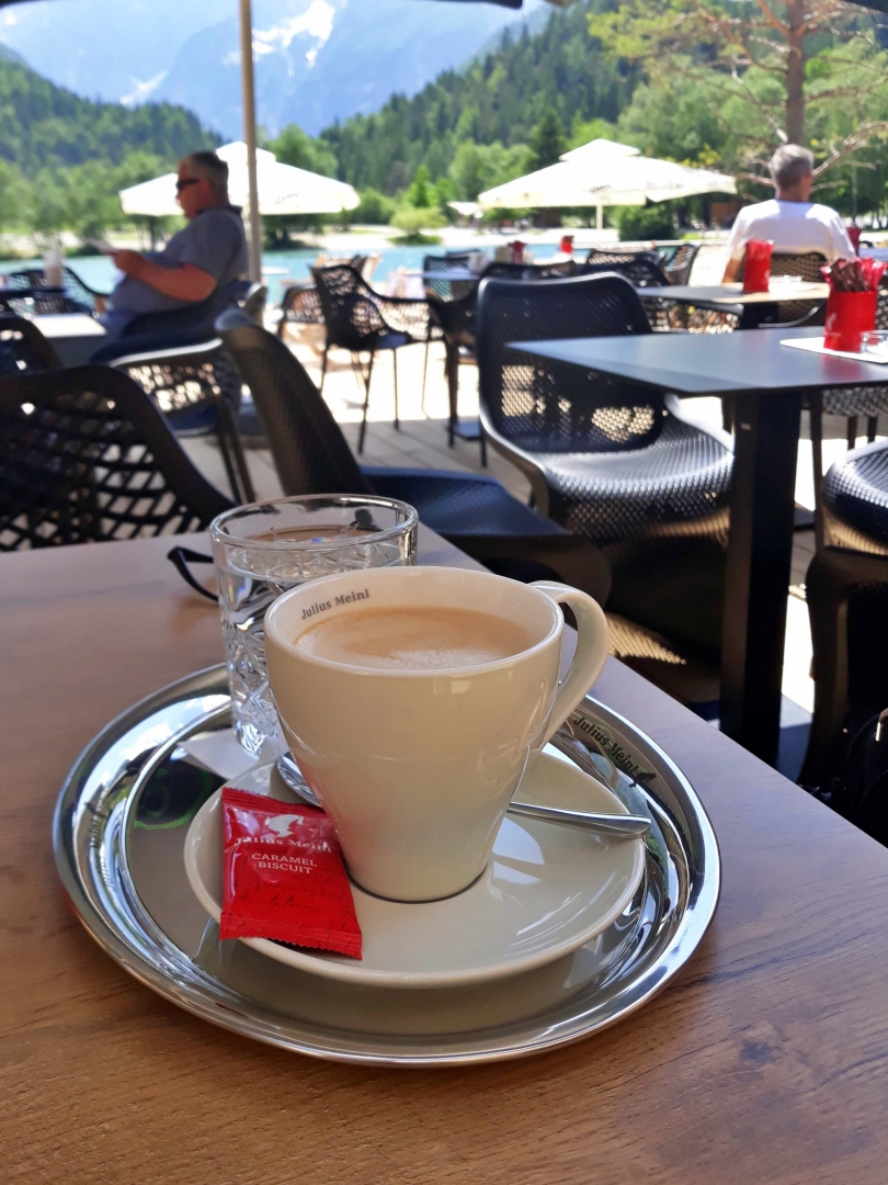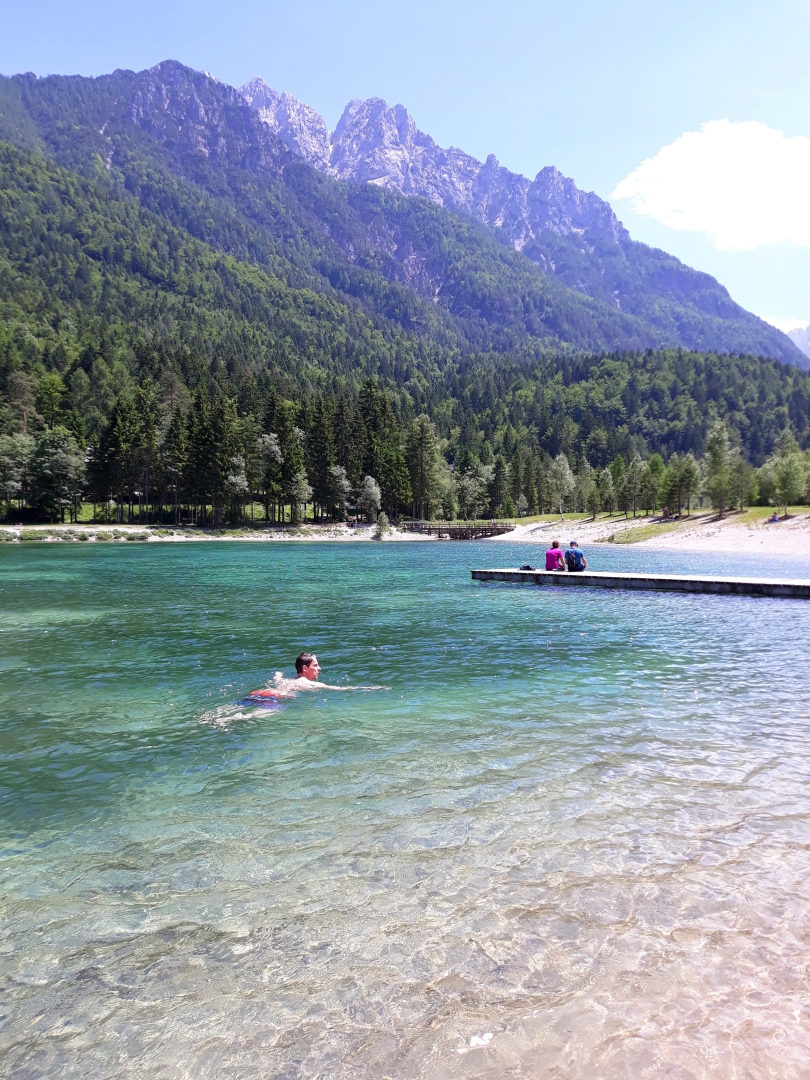 Saimme uintihalut tyydytettyä, kun poikkesimme Lake Jasnan alppijärvelle. Paikka oli tyrmäävän kaunis, suorastaan dramaattinen ja jotenkin epätodellinen. Joimme kahvit kahvilan terassilla ja hetken vain tuijotimme mykistävää maisemaa.