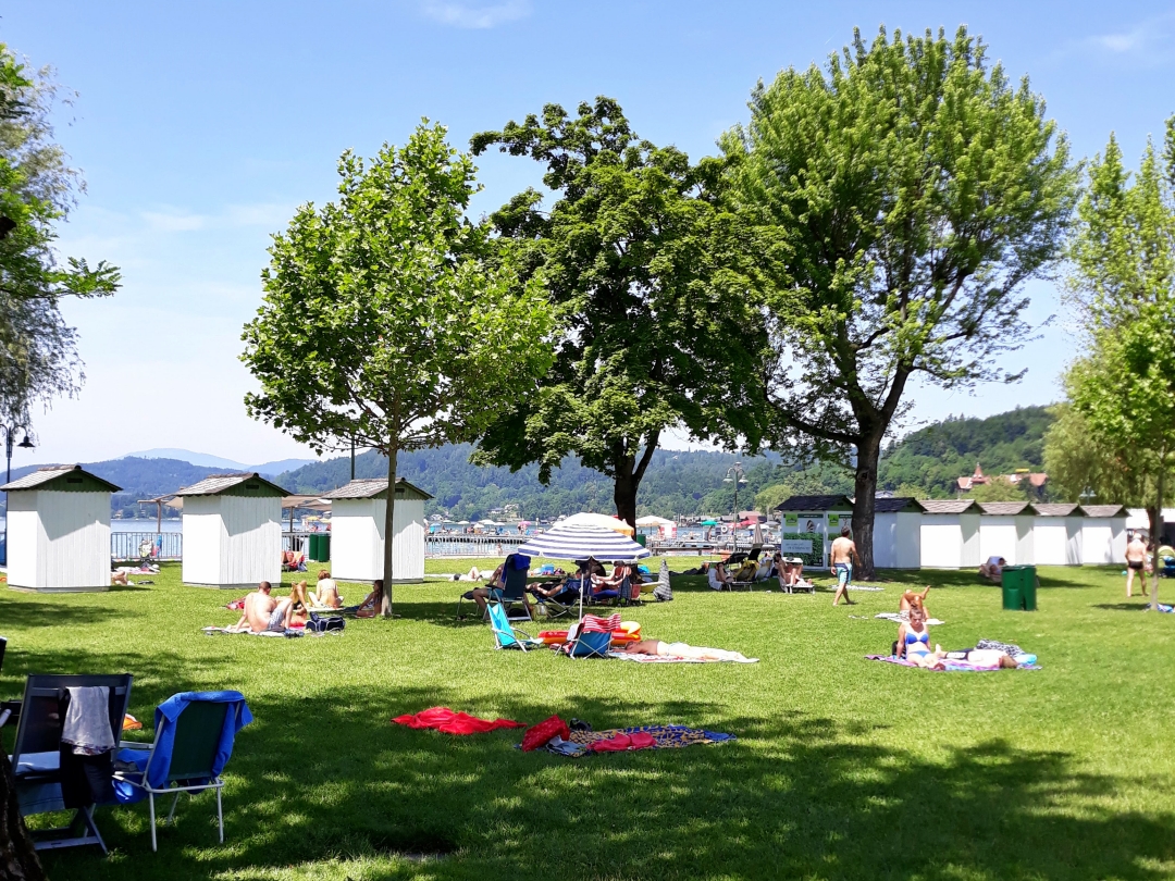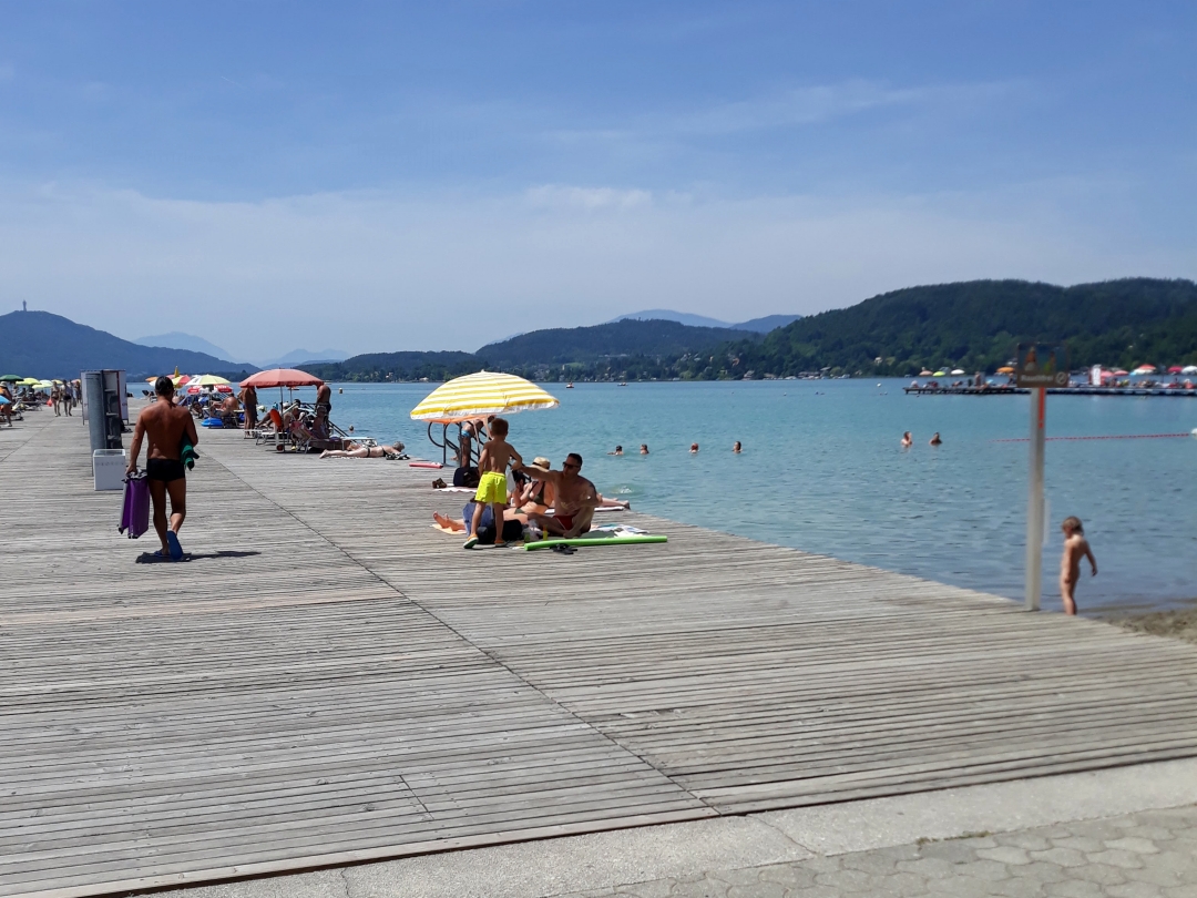 Itävallassa on myös kauniita järviä, joten hellekeleillä sielläkin pääsee pulahtamaan, kunhan valitsee järvellisen matkakohteen. Uinti olikin jälleen ohjelmassamme, ja tällä kerralla vierailimme Faaker Seen maksullisella uimarannalla. Se oli supersiisti ja viihtyisä. Vesi oli huomattavasti lämpimämpää kuin Slovenian alppijärvissä.