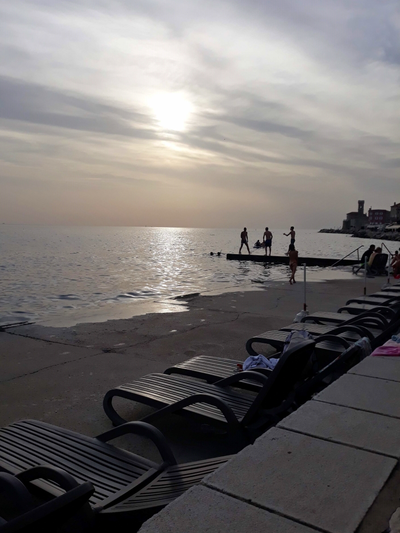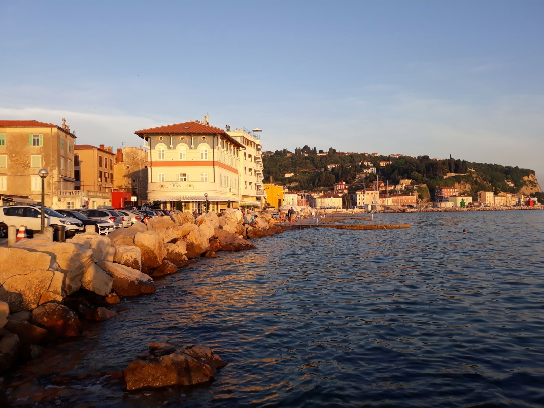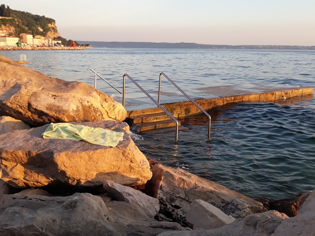 Piranissa ei ole isoa, hienoa hiekkarantaa, vaan pieni kivinen ranta kaupungin laitamilla. Mutta rantakadun varrelta pääsee mereen melkein mistä vain, sillä pitkin rantaa on uimaportaita ja siellä täällä myös laiturityyppisiä betonitasanteita. Itse ranta on kivikkoinen, mutta vesi on kirkasta, puhdasta ja ihanan virkistävää – ja huomattavasti lämpimämpää kuin alppijärvissä.