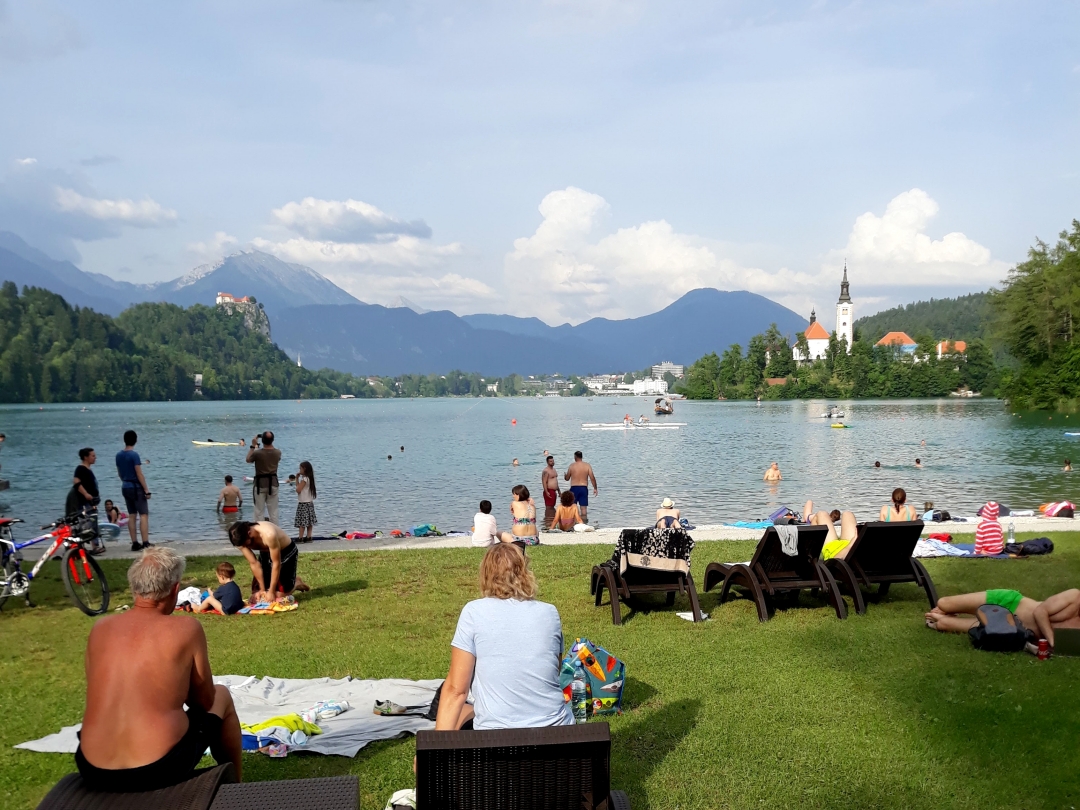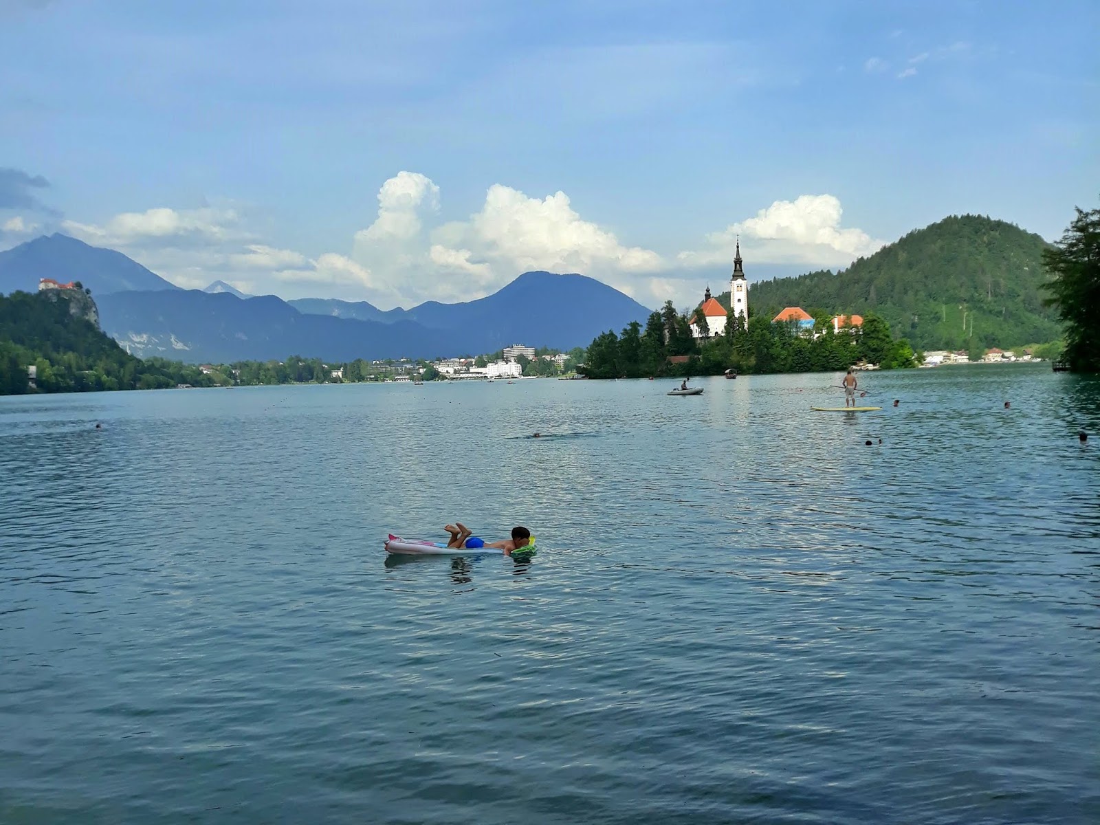 Bledissä voi ottaa rennosti vehreitä järvi- ja vuoristomaisemia ihaillen tai siellä voi viettää aktiivilomaa vaikkapa patikoiden, pyöräillen, ratsastaen ja meloen. Itse olemme uinti-intoilijoita, joten kävimme illemmalla vielä uimassa Bledin maksuttomalla uimarannalla. Uiminen postikorttimaisemassa oli mieletön kokemus.