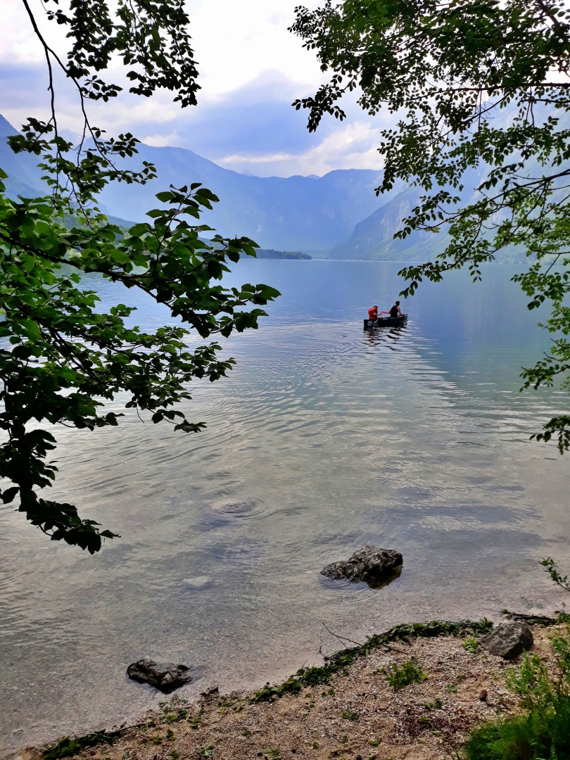 Parin minuutin pisarakuuro oli pian ohi ja rantauduimme pieneen uimapoukamaan. Vaihdoimme uikkarit päälle ja pulahdimme veteen, joka oli niin kirkasta, että kalat ja pohjakivet näkyivät. Vesi oli vuoristojärvessä viileää, jonkun mielestä ehkä jopa kylmää, mutta uiminen oli nautinnollista. Sen jälkeen, mieli ja keho rentoutuneena, palasimme Blediin.
